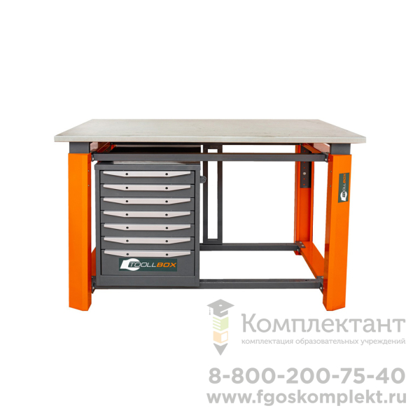 Столешница изготовлена из фанеры 30мм и закрыта стальным оцинкованным листом 1,2мм. Глубина столешницы 750мм. Предусмотрена регулировка положения столешницы по высоте. Высота регулировки столешницы верстака может регулироваться по желанию заказчика в диапазоне 924-1044 мм.