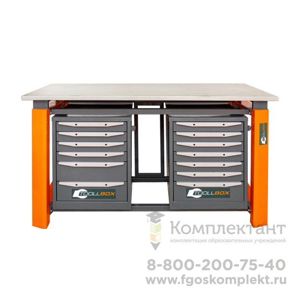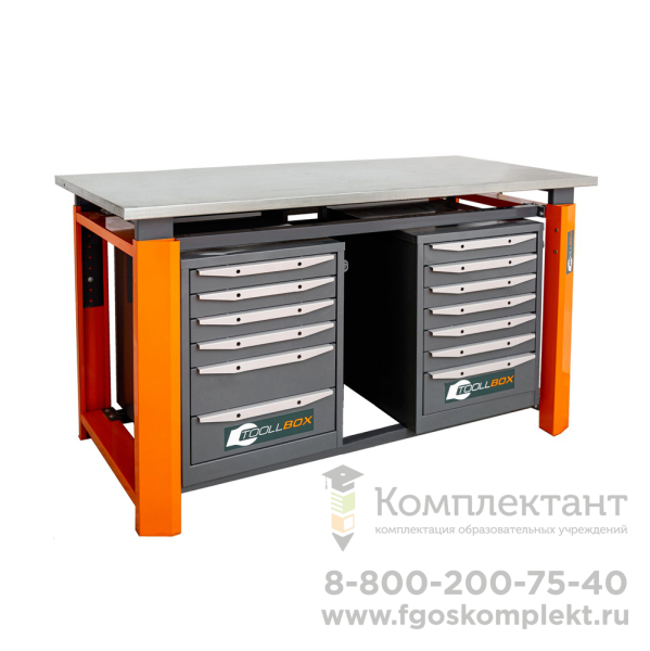 Двухтумбовый, комбинированный, одна тумба комплектуется 6-ю выдвижными ящиками, имеет петли для запирания на навесной замок, другая тумба комплектуется 7-ю выдвижными ящиками, имеет петли для запирания на навесной замок.