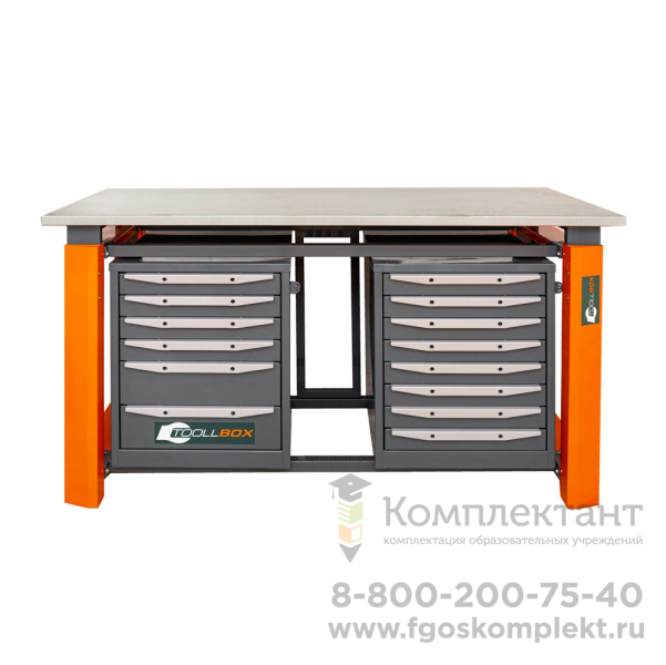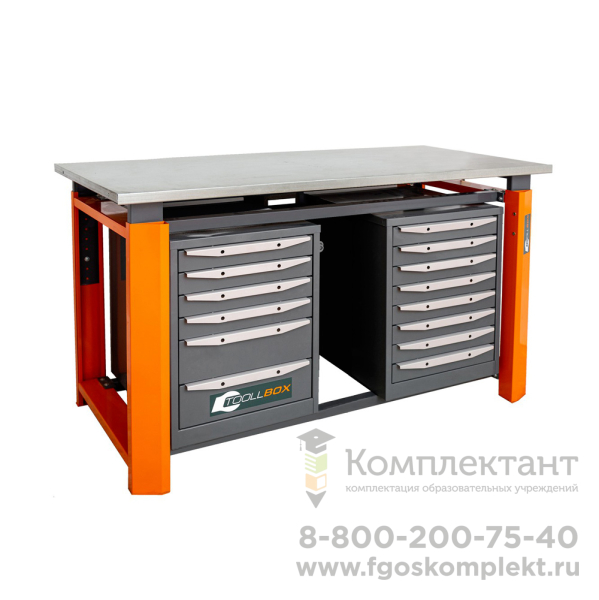 Двухтумбовый, комбинированный, одна тумба комплектуется 6-ю выдвижными ящиками, имеет петли для запирания на навесной замок, другая тумба комплектуется 8-ю выдвижными ящиками, имеет петли для запирания на навесной замок.