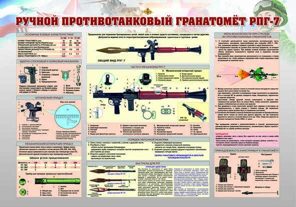 Стенд с информацией об устройстве и правилах стрельбы из 40-мм ручной противотанковый гранатомет РПГ-7. Предназначен для размещения в кабинете ОБЗР и военной подготовки в образовательном учреждении.