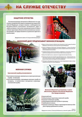Стенд с информацией о воинской обязанности и военной службе. Предназначен для размещения в кабинете ОБЗР и военной подготовки в образовательном учреждении.