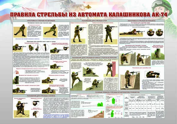 Стенд с информацией о правилах стрельбы из автомата Калашникова АК-74. Предназначен для размещения в кабинете ОБЗР и военной подготовки в образовательном учреждении.