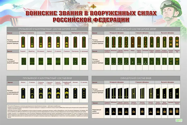 Стенд с информацией о воинских званиях в Вооруженных Силах Российской Федерации. Предназначен для размещения в кабинете ОБЗР и военной подготовки в образовательном учреждении.