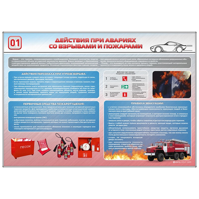 Стенд "Действия при авариях со взрывами и пожарами" представляет собой панель, на которой размещена информация о действиях персонала при угрозе взрыва, правилах эвакуации и первичных средствах пожаротушения.