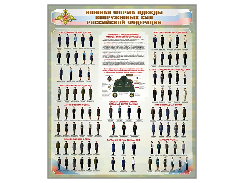 Стенд предназначен для наглядного отображения информации об обмундировании представителей Вооруженных сил РФ, а также для формирования у учащихся или курсантов представления об особенностях военной службы.
