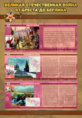 Стенд с информацией о крупных сражениях и важных событиях Великой Отечественно Войны. Предназначен для размещения в кабинете ОБЗР и военной подготовки в образовательном учреждении.