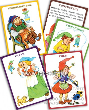 Игру "Семейка Гномс" можно использовать в индивидуальной и групповой психологической работе с детьми и взрослыми, а также в работе с семьей.В инструкции приводятся основные идеи и правила игр, в ходе которых дети и взрослые могут развивать умение выражать свои чувства словами и понимать эмоциональное состояние других людей. Игра расширяет эмоциональный словарь и создает ситуацию, в которой взрослые и дети могут разговаривать о том, что они чувствуют, когда и почему. Согласитесь - подобные ситуации сами по себе возникают в нашей жизни не так уж часто! Иллюстрирует эмоции симпатичная семейка гномов: они и огорчаются, и радуются, и завидуют, и восхищаются. Как играть Для игры вдвоем выберите 4 линейки, втроем – 6 линеек, вчетвером – любое количество линеек, начиная с шести, впятером – все линейки, вшестером – 6, 9 линеек и т.д. Если игроков больше шести – рассчитайте количество линеек, исходя из того, что в начале игры карт на руках у всех игроков должно быть поровну. Перемешайте карты и раздайте их все. Каждый игрок по очереди просит у другого карту из какой-нибудь линейки. Если у того эта карта есть, он обязан ее отдать. Если игрок получает нужную карту, то он продолжает ход. В противном случае ход переходит к следующему. Как только игрок собирает 4 карты одной линейки, он должен громко сказать: «Семейка Гномс… (например, злится)», и выложить перед собой собранную линейку. Игра заканчивается, когда все линейки собраны в полном составе. Выигрывает тот, кто соберет больше всего линеек. Цель игры: собрать как можно больше линеек чувств. Упрощенные правила (для самых маленьких игроков) Из колоды выберите несколько простых линеек, например, линейки радости, грусти, злости, тревоги. Остальные карты отложите в сторону. Раздайте каждому участнику карты-подсказки. Карты-портреты в этой игре не задействованы. Пример психологического упражнения с семейством Громс «Мне помогает, мне мешает…» Для того чтобы помочь детям и взрослым понять, что каждое чувство может как помогать, так и мешать, предлагаем вам следующее упражнение. Возможно, в начале упражнения детям понадобится помощь. Для детей помладше мы советуем отобрать в колоду достаточно однозначные чувства: злость, радость, страх, обида. Для старших детей и взрослых подойдут карты с более сложными чувствами (отчаяние, стыд, горе). Лучше, когда участников больше трех, однако вполне можно сыграть и вдвоем. Инструкция: Положите колоду с чувствами на середину стола. Каждый участник тянет карту и говорит, в каких ситуациях ему это чувство мешает, а в каких помогает. Обсудите с участниками, какие чувства могут стать для них ресурсами в преодолении трудностей. Что в комплекте карточки с изображениями основных чувств и эмоций и их оттенков (68 карточек) 6 карт подсказок инструкция