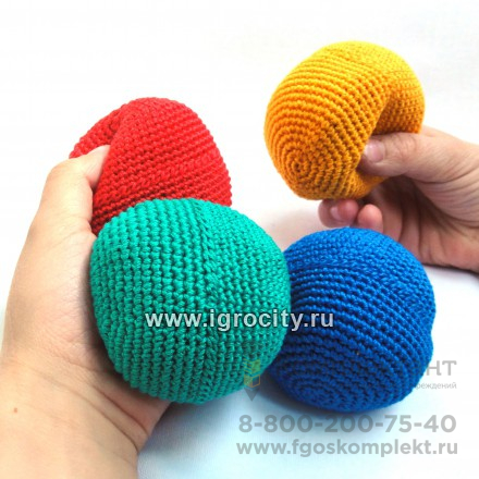Вязаные мячики с наполнителем определенного веса и плотности для кинезиологических упражнений. С помощью кинезиологических мячей можно проводить упражнения и игры на Кругу (ношение предметов на разных частях тела, перекладывание и перебрасывание предметов, передача друг другу в паре или в группе). Польза, которую приносят кинезиоупражнения, колоссальная. Ребенок не только становится сообразительным, активным, энергичным и контролирующим себя, - улучшается его речь и координация пальцев. Кинезиологические упражнения широко используются в логопедии, психологии, дефектологии, нейропсихологии, педиатрии и педагогике. Такие задания не только развивают нервные связи, но и доставляют детям удовольствие. Комплект 4 шт. (по 1 шт. основных цветов: красный, желтый, синий, зеленый). Размер 10х10 см. Наполнение: крупный чистый речной песок.