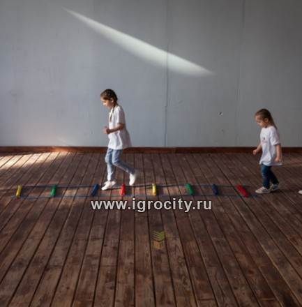 Эффективный спортивный тренажер. Такое приспособление помогает развивать скоростные навыки, маневренность, выносливость и координацию движений при выполнении различных физических упражнений. Материал: ткань – оксфорд – 100% полиэстер, поролоновая труба, полипропиленовые шнур с сердечником. Комплектация: 8 перекладин с петлями по бокам, 2 шнура, мешок для хранения. Размер: перекладина – диаметр 5 см, длина 30 см, длина шнуров – 3 метра. Активные движения руками при выполнении упражнений помогает подобрать оптимальный ритм. Соответственно их делать становится намного легче. В некоторых упражнениях руки служат в качестве балансира, предоставляют возможность делать их активнее и резче. При выполнении упражнений с нагрузкой на ноги они должны быть согнуты в коленях. Эти навыки в дальнейшем пригодятся в любой спортивной игре. Хороший эффект дают соревновательные упражнения. Две лестницы размещаются параллельно друг другу на спортивной площадке и дети парами выполняют различные упражнения, соревнуясь между собой. Важно! Шнуры для выполнения упражнений должны быть хорошо натянуты и располагаться параллельно друг – другу. Перекладины должны располагаться параллельно друг – другу, если предполагаются упражнения на скоростные навыки, маневренность. Если детям предлагаются упражнения на внимательность и координацию, то перекладины могут располагаться под любым углом. В этом случае мы объясняем детям, что скорость не главное, Их задача пройти всю лесенку без ошибок. Ниже представлено несколько упражнений на развитие скоростных навыков и маневренности. Универсальные классики Это самое простое и знакомое многим упражнение. Внизу лесенки занимается исходная позиция, ноги должны быть расположены на ширине плеч. Ребенок отталкивается ступнями ног, прыгает вперед, встает после приземления в первой ячейке тренажера. Далее он совершает прыжок, приземляется в следующую ячейку на обе ступни. После следующего прыжка необходимо приземлиться уже на правую ступню, затем опять на две ноги. Внутрь наружу Перед началом упражнения ребенок занимает исходную позицию. Для этого он становится перед лестницей, ноги расставляет на ширину плеч. Сначала делается шаг (не прыжок) левой ступней в первую ячейку тренажерной лесенки, затем шаг правой ногой. После постановки правой ступни в первую ячейку, левая ступня мгновенно убирается и устанавливается сбоку следующей ячейки, затем правая нога устанавливается аналогично с другого бока второй ячейки. Дальше левой ногой выполняется шаг внутрь лестницы, после чего возвращается в первоначальную стойку правая нога. Шаг в сторону Упражнения на лесенке начинается с левого угла. В первых двух вариантах исходное положение было по центру спортивного снаряжения, в этом случае необходимо несколько переместиться влево. 1. Первый шаг делается левой ногой внутрь первой секции, без остановки сюда же перемещается ступня правой ноги. 2. Далее необходимо переместиться вправо за пределы лесенки сначала левой, затем правой ступней. 3. Следующее движение во вторую секцию начинается опять с левой ступни влево по диагонали вверх и завершается правой ступней. 4. Затем нужно выйти за пределы лестницы опять сначала левой, потом правой ногой. Спортивное танго Исходное положение аналогично первоначальному положению в «Ша