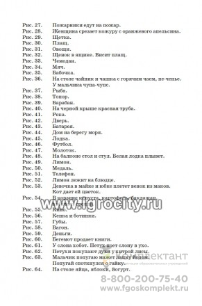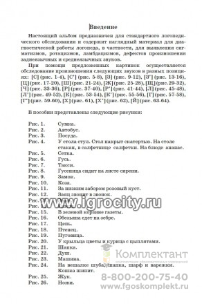 Альбом предназначен для стандартного логопедического обследования. Он состоит из цветных предметных и сюжетных картинок для диагностической работы логопеда и предназначен для выявления сигматизмов, ротацизмов, ламбдацизмов, дефектов произношения заднеязычных и среднеязычных звуков. Этот материал необходим при обследовании лиц с нарушениями звукопроизношения. Картинки подобраны таким образом, чтобы можно было определить состояние произношения звука в разных позициях в слове, а также в словах простой и сложной звукослоговой структуры. При помощи предложенных картинок осуществляется обследование произношения следующих звуков в разных позициях: [С] (рис. 1-4), [С’] (рис. 5-8), [3] (рис. 9-12), [3’] (рис. 13-16), [Ц](рис. 17-20), [Ш](рис. 21-24), [Ж] (рис. 25-28), [Щ] (рис.29-32), [Ч] (рис. 33-36), [Р] (рис. 37-40), [Р’] (рис. 41-44), [Л] (рис. 45-48), [Л’] (рис. 49-52), [К] (рис. 53-54), [К’] (рис. 55-56), [Г] (рис. 57-58), [Г’] (рис. 59-60), [X] (рис. 61), [X’] (рис. 62), [Й] (рис. 63-64).