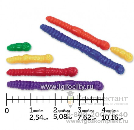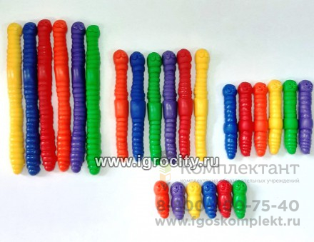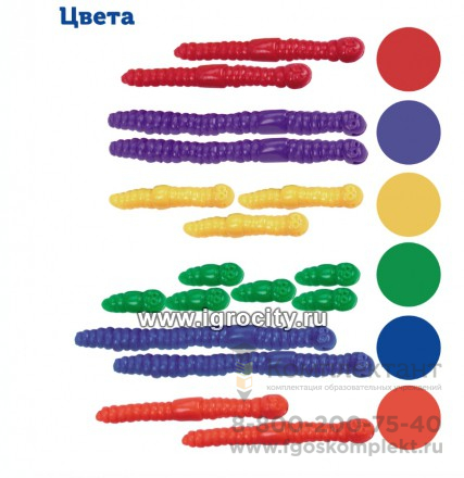 Первые математические навыки с гибкими красочными червячками. Всего в наборе 24 червячка в шести цветах и четырёх размерах. С червячками возможно множество вариантов игр: изучение цвета понятие длинный/короткий, больше/меньше, выше-ниже сортировка по цвету/длине/количеству изучение состава числа соотношение цифры и количества сложение и вычитание логические дорожки последовательностей и т.д. В наборе: 24 червячка