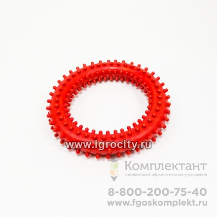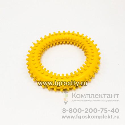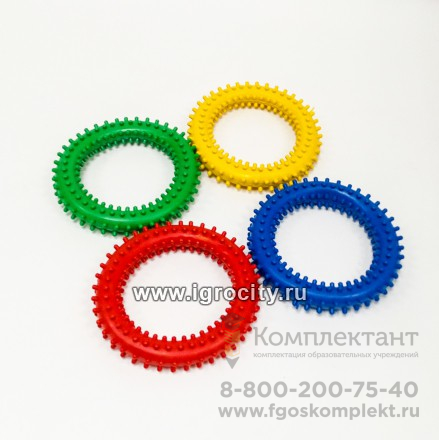 4 массажных кольца с шипами. Цвета колец: красный, желтый, синий, зеленый. Диаметр 130 мм. Можно использовать как кистевой эспандер, а также для игр на сортировку предметов по цвету.
