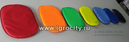 Комплектация: 7 мягких плоских разноцветных фигур овальной формы, в мешке для хранения. Фигуры выполнены в цветах радуги. Размер: овал вписан в прямоугольник со сторонами 40 и 32 см, мешок для хранения - 73х60 см.