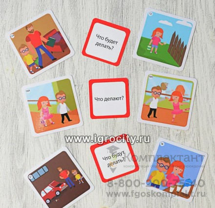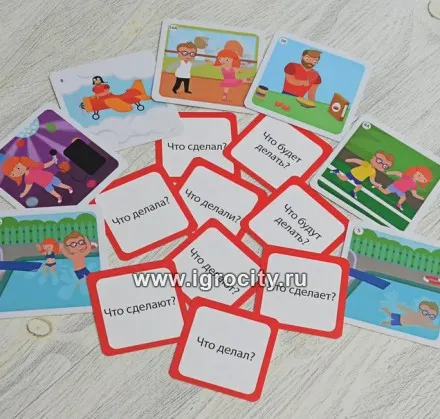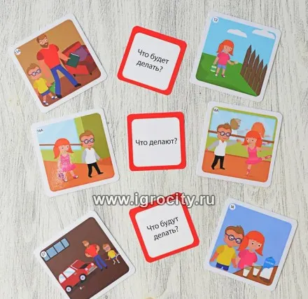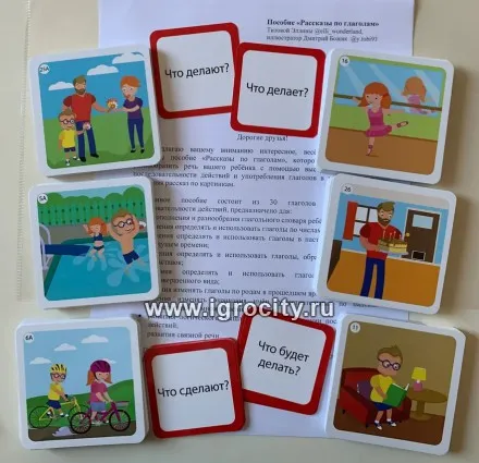 Пособие «Рассказы по глаголам» поможет развить и разнообразить речь вашего ребёнка с помощью выстраивания правильной последовательности действий и употребления глаголов в правильной форме, составляя рассказ по картинкам. Для чего: Пополнения и разнообразия глагольного словаря ребёнка; умения определять и использовать глаголы по числам; умения определять и использовать глаголы в настоящем, прошедшем и будущем времени; умения определять и использовать глаголы, образованные с помощью приставок; умения определять и использовать глаголы совершенного и несовершенного вида; умения изменять глаголы по родам в прошедшем времени; умения изменять окончания имён существительных по падежам в единственном и множественном числах; развития логического мышления при выстраивании последовательности действий; развития связной речи. Пособие включает в себя: 192 карточки, из них: 180 карточек действий (30 сюжетов по 3 карточки на каждый глагол в единственном и множественном числе будущего, настоящего и прошедшего времени) 12 карточек с вопросами к действиям в настоящем, прошедшем, будущем времени совершенного и несовершенного видов Как играть «Закончи рассказ» - взрослый выкладывает последовательно карточки одного сюжета, называя действия и просит ребёнка закончить рассказ по последней карточке. «Начини и закончи рассказ» - взрослый выкладывает в правильной последовательности карточки одного сюжета и просит ребёнка начать рассказ, после чего взрослый называет следующее действие, а ребёнок заканчивает рассказ. «Что пропущено?» - из трёх карточек одного сюжета взрослый выкладывает на стол только две, ребёнку предлагается разложить карточки в правильной последовательности и определить, какая часть действия пропущена? (подходит для неговорящих детей). «Скажи по-другому» - ребёнку предоставляется возможность предложить свои варианты глаголов, которые могут быть использованы в данном сюжете. «Расскажи историю» - ребёнок раскладывает в правильной последовательности карточки одного сюжета и составляет историю с персонажами карточек, используя дополнительные изображения на карточках. «Подбери пару» - взрослый выкладывает парные карточки с персонажами в единственном и множественном числе, показывает на одну карточку и озвучивает фразу, ребёнку предлагается подобрать пару для предъявленной взрослым картинки и назвать действие полной фразой. «Покажи, где…?» - взрослый выкладывает на стол несколько карточек и называет действие, ребёнок должен найти подходящий верный вариант (подходит для неговорящих детей). «У кого что?» - взрослый выкладывает на стол парные карточки с персонажами в единственном и множественном числе, показывает пару и задаёт вопрос, например: «У него велосипед, а у них что?» (У них велосипеды). «Что делает? – Что делают?» - взрослый выкладывает на стол парные карточки с персонажами в единственном и множественном числе в одном из видов глагольного времени, показывает пару и задаёт вопрос, например: «Он едет. А что они делают?» («Они едут»). Задание можно усложнить, задав вопрос, например: «Он едет на велосипеде. А они на чём?» (Они едут на велосипедах). «Действия во времени» - взрослый выкладывает на стол сюжет из трёх карточек в единственном или множественном числе, подставляет под каждую карточку нужный вопрос, используя 