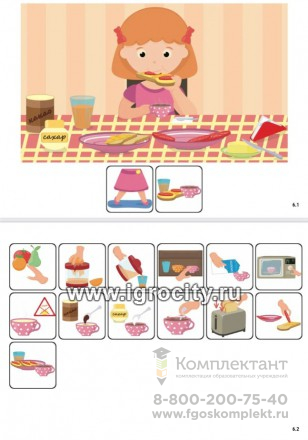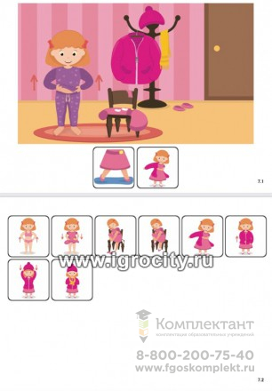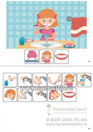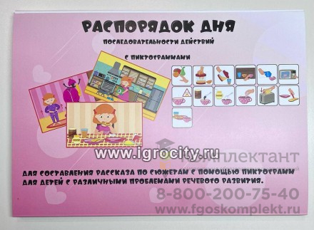 Для чего: для составления рассказа по сюжетам с помощью пиктограмм для детей с различными проблемами речевого развития. для использования пиктограмм в качестве альтернативной дополнительной коммуникации. для формирования представления о режиме и распорядке дня, о социальном поведении в обществе, семье и в школе. «Распорядок дня» - это сборник последовательности действий дня из повседневной жизни ребёнка, состоящий из 16 сюжетов по следующим процедурам: принять душ помыть руки сходить в туалет (2 вида) почистить зубы позавтракать одеться собраться и идти в школу (2 вида) в школе на перемене в библиотеке в спортивном зале в бассейне ухаживать за домашним питомцем идти спать В составе сборника "Распорядок дня для девочки": 32 листа (плотный картон и ламинация), состоящих из 16 сюжетов и 223 пиктограмм.