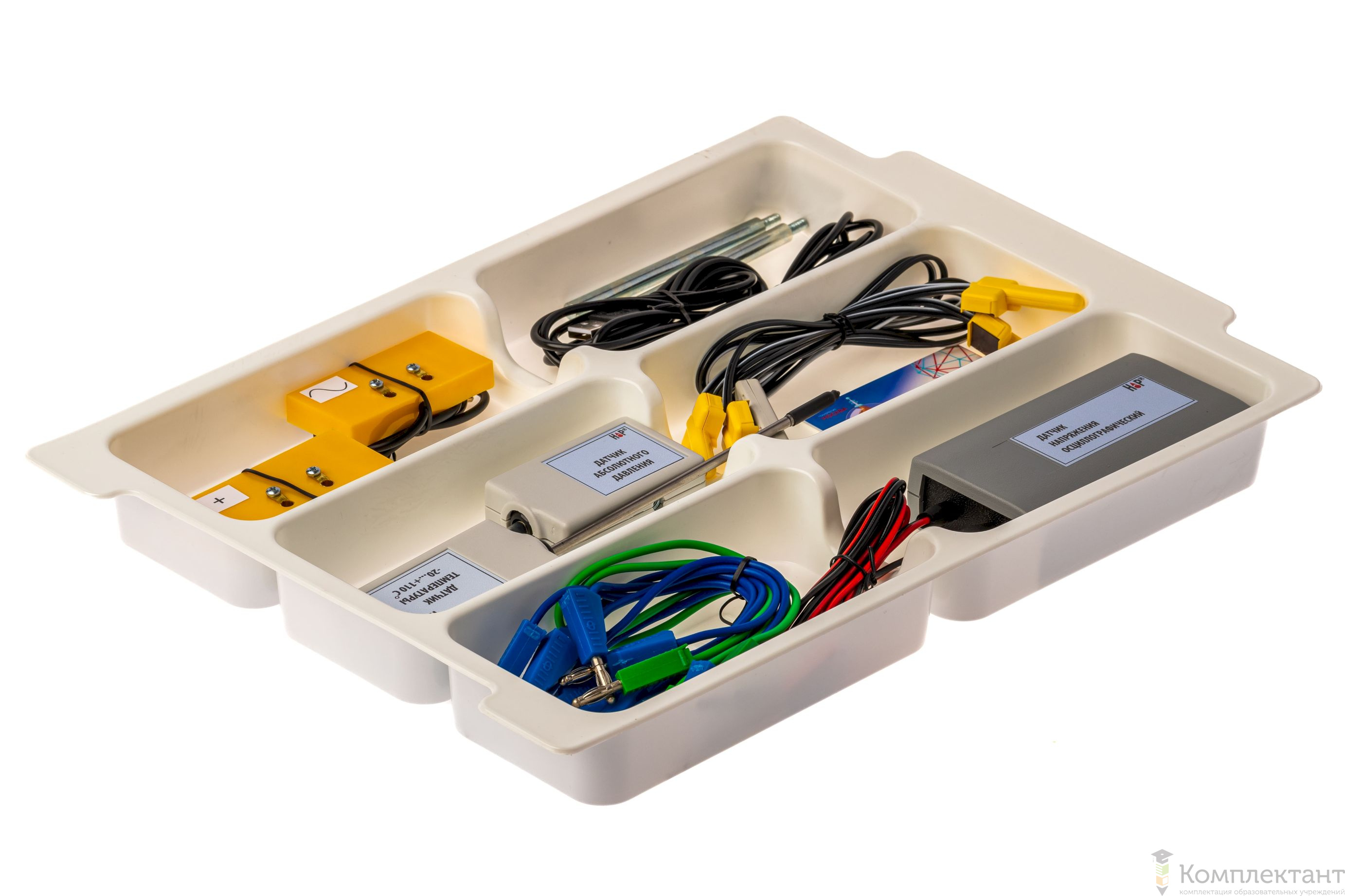 Цифровая лаборатория по физике представляет собой набор элементов и датчиков, на базе которых поочередно собираются установки для выполнения работ по изучению законов механики, молекулярной физики, электричества и оптики.
