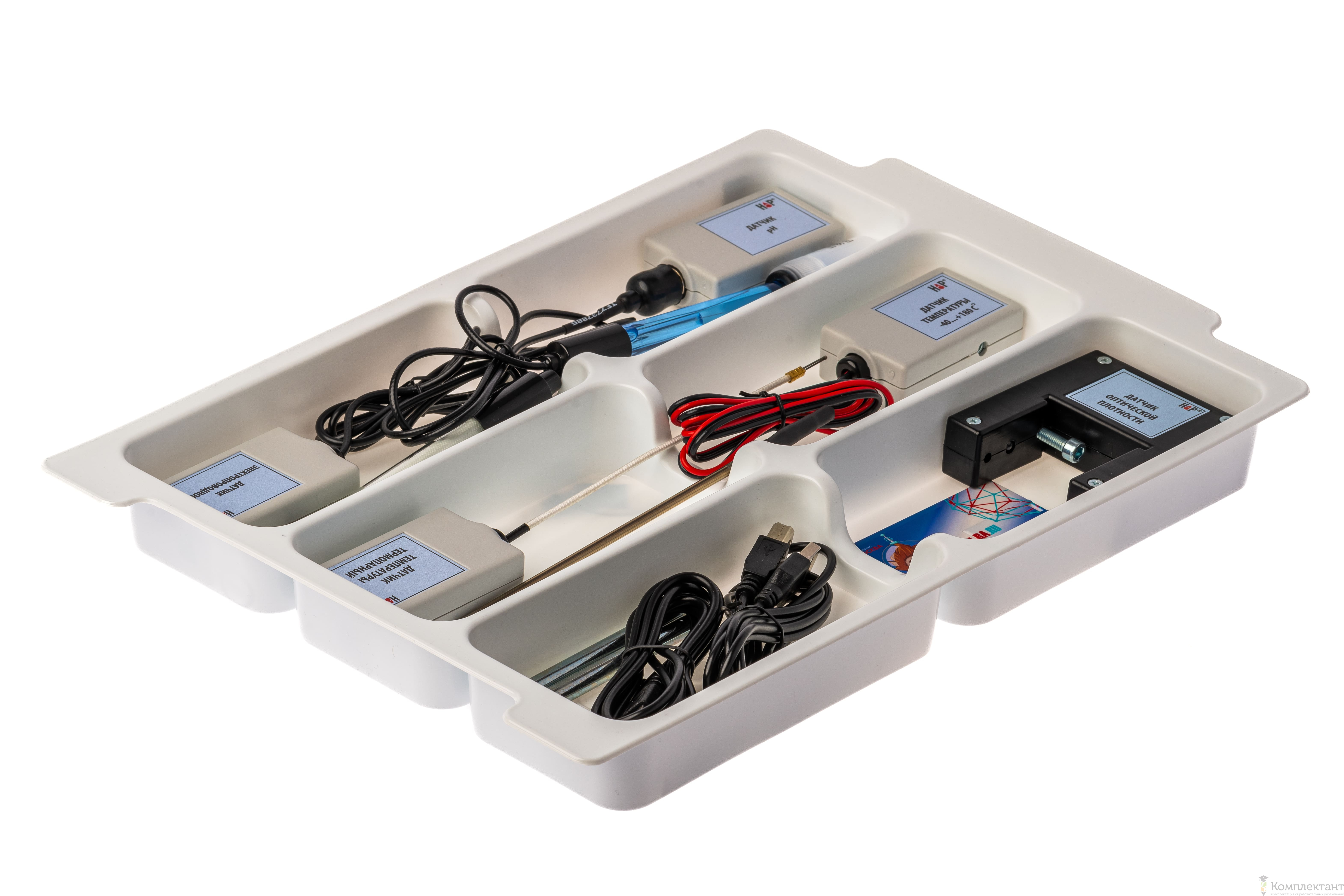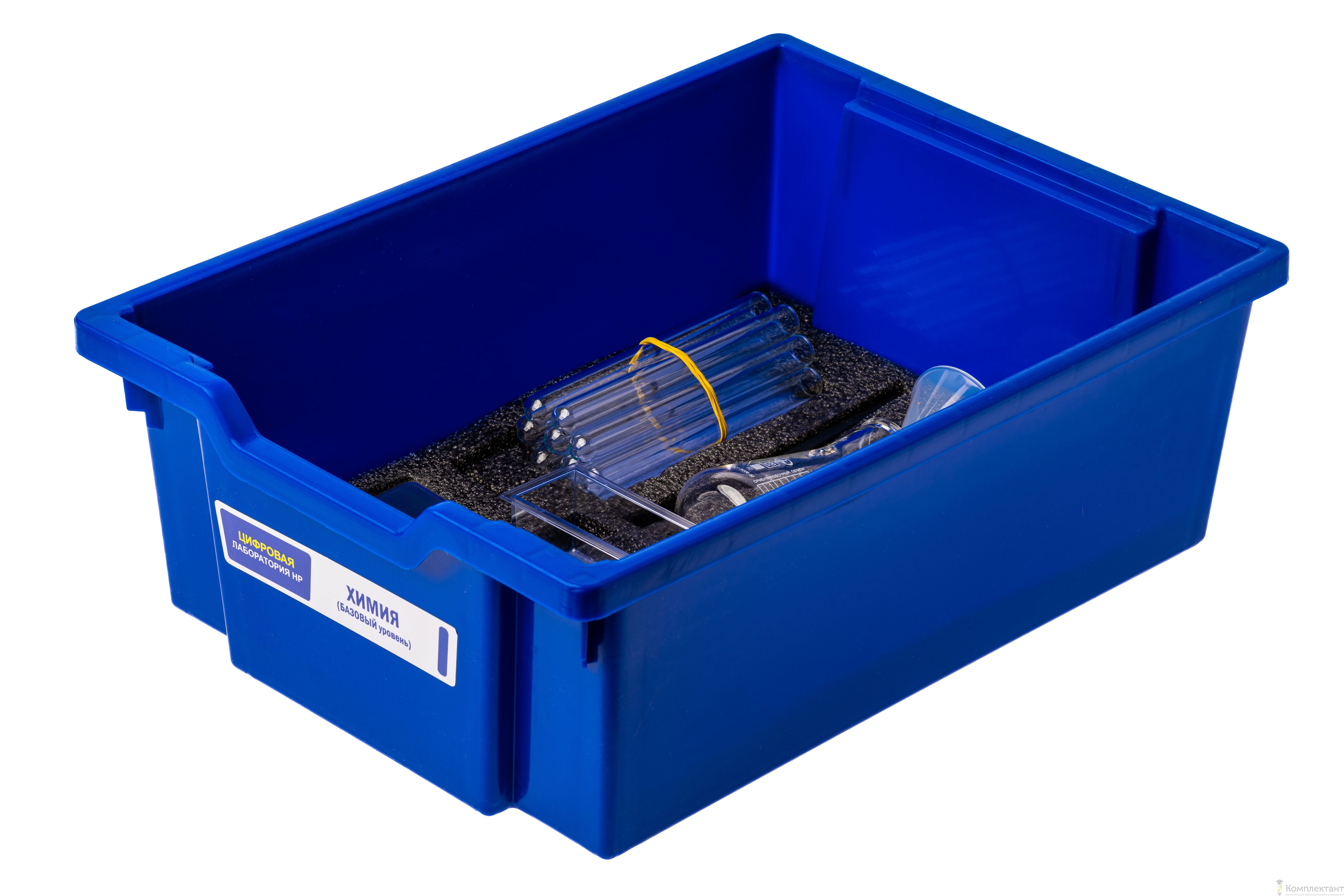Цифровая лаборатория укомплектована в пластиковую систему хранения, которая закрывается прозрачной пластиковой крышкой на защелках для обеспечения наблюдения за содержимым. Комплект оборудования и датчики в системе хранения располагаются на ложементах.