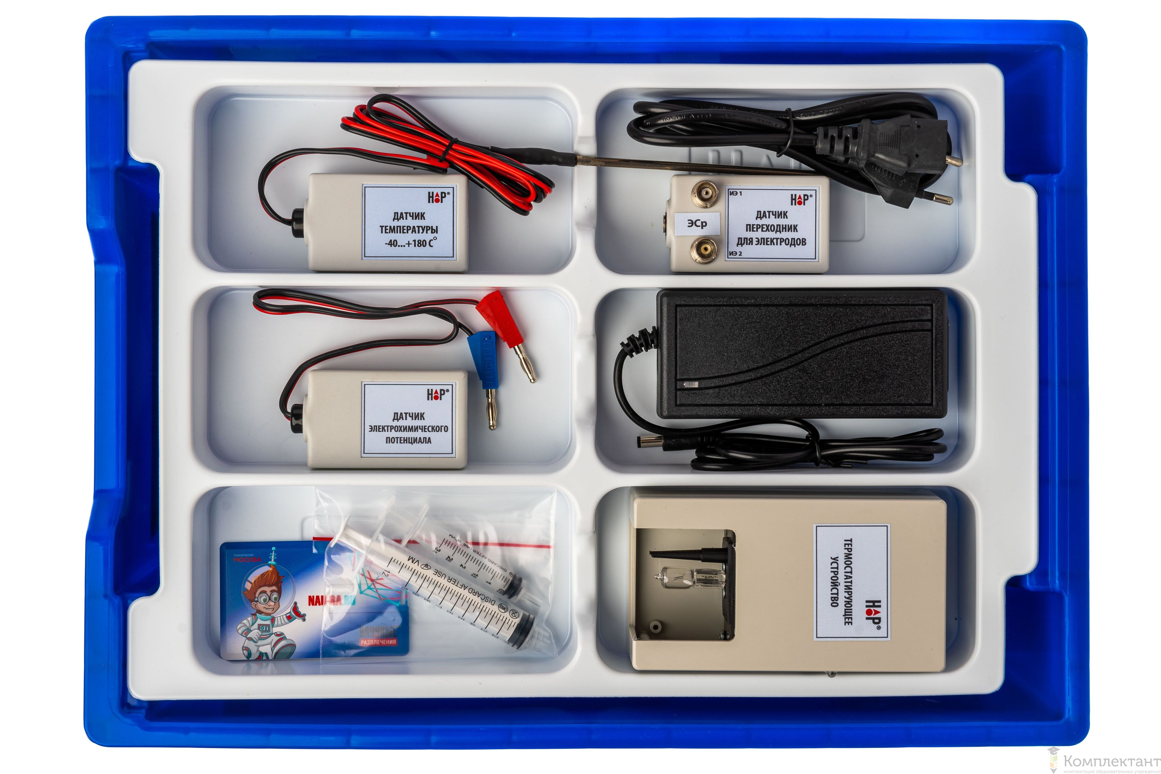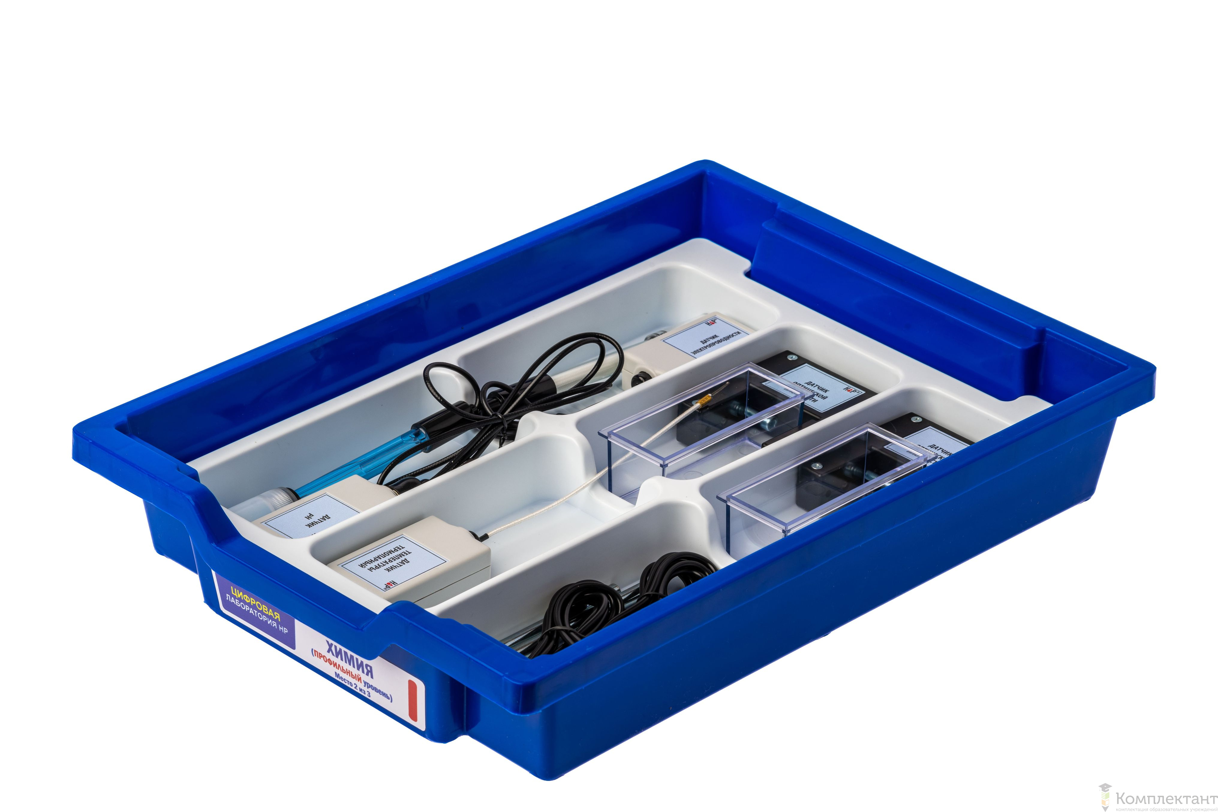Цифровая лаборатория укомплектована в пластиковую систему хранения, которая закрывается прозрачной пластиковой крышкой на защелках для обеспечения наблюдения за содержимым. Комплект оборудования и датчики в системе хранения располагаются на ложементах.